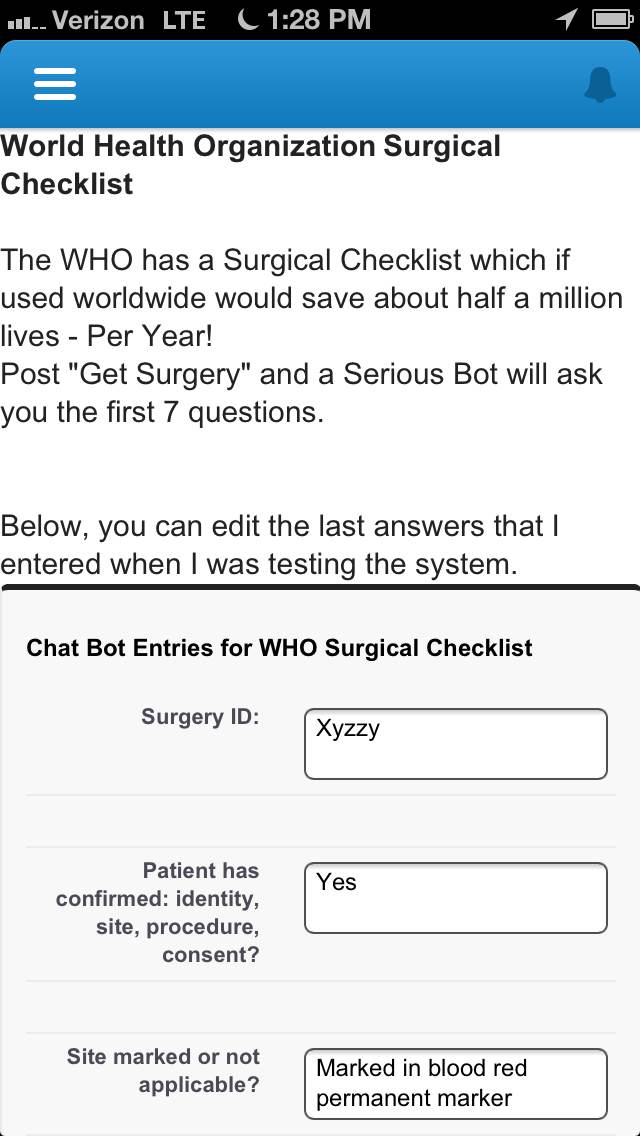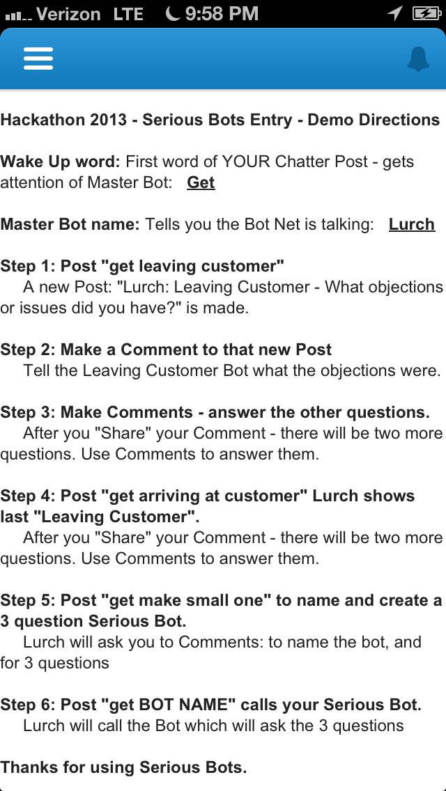 The User Experience? Chatter – Salesforce1 is the conduit, but Instead of people, you Chat with SeriousBots. Chatter becomes a simpler, more engaging user interface - reducing the need for invoking salesforce.com’s more complex form entry applications.